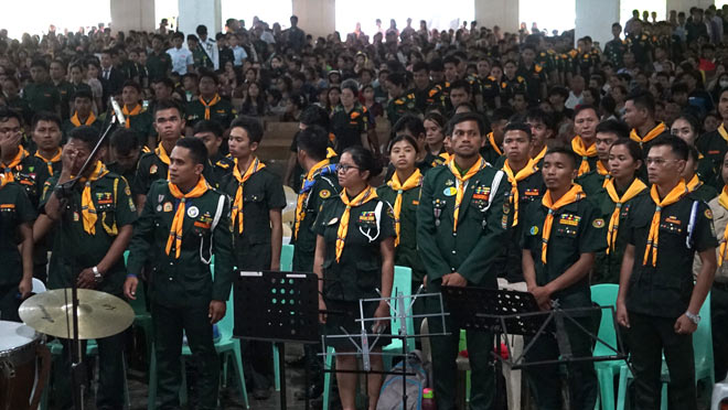 Delegates gathered at the open space facing the grandstand, where the Sundown Worship youth directors and participants were assembled.